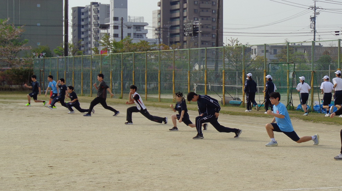 お知らせ/学校生活 朝の部活動 2025年4月23日 美術部は、月・水・金の朝部活はグランドで体力づくりのため、ランニングや筋トレに取り組んでいます。 陸上部は、グランドで活動しています。横1列に並んでトレーニングを行ったあと、2人1組で短距離走を行います。大会参加に向けてがんばっています。
