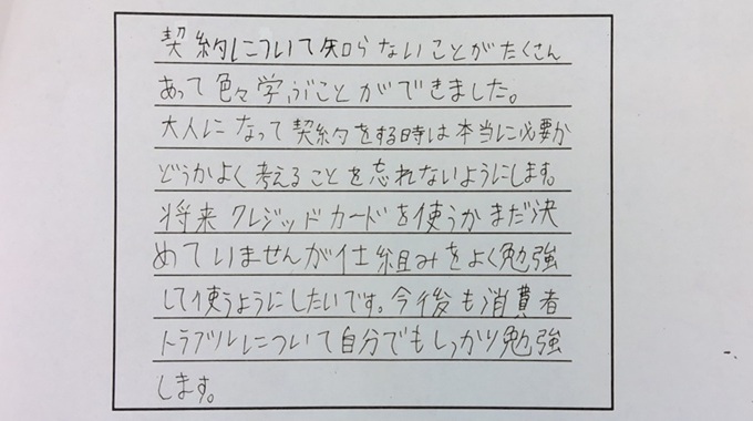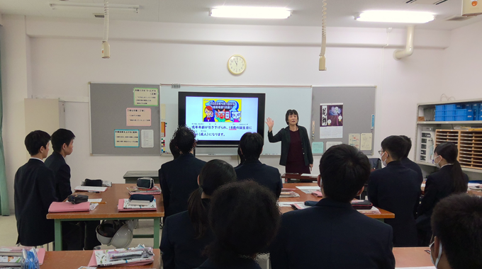 11月10日に消費者教育講座が行われました。桃花校舎では、毎年3年生の秋に愛知県消費者教育コーディネーターの方を講師にお招きして、契約や若者に起こりやすい消費者トラブルについて学習を行っています。代表者によるロールプレイングで実際の場面を想定した対応についても学びました。