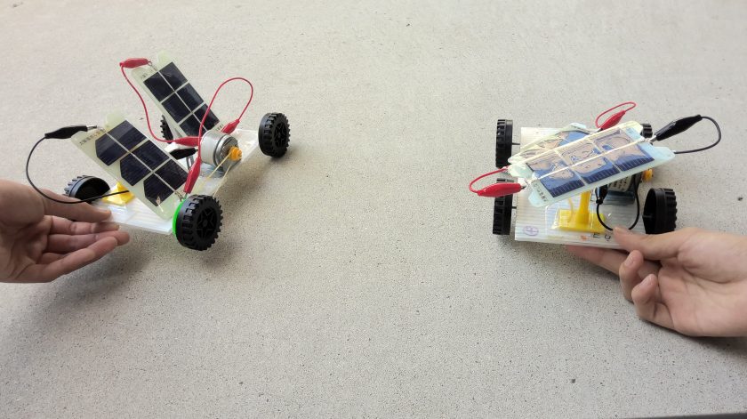 理科の授業で太陽光エネルギーを太陽電池で電気エネルギーに変換できることを学習しました。グループに分かれ太陽光パネル、モーター、タイヤを組み立てて「ソーラーカー」を作り、レース「T1グランプリ」を行いました。
