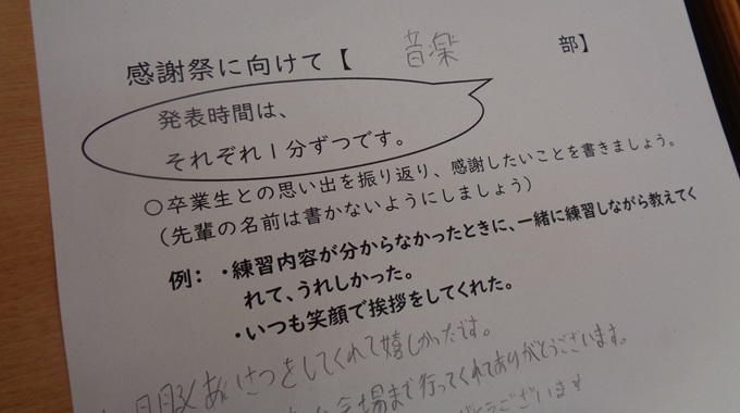 1年生は、部活動ごとに部活動で先輩に感謝していることを伝えます。