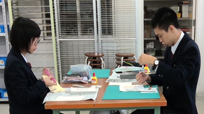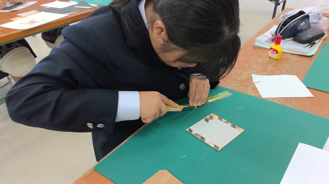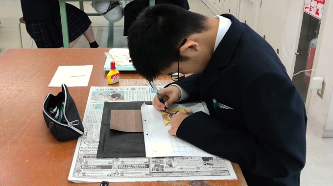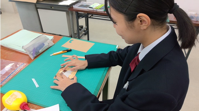 作品を作ってみて、生徒からは「形に合わせて切るのが難しかったです。」「どんなデザインにするか考えて作るのが楽しかったです。」などの感想がありました。次の桃花祭では、生徒たちの個性あふれる作品を出品しますので、お楽しみにしていてください。