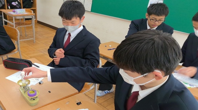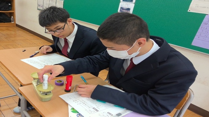 1年理科の授業で上皿天秤の使い方を学習しました。文房具の重さを予想し、どちらが重いか検証しました。まずは手で持ってみて重さを感じ、結果を予想します。予想と違う結果がでたときには、落胆の声もあがりましたが、どの生徒も興味をもって楽しく実験する様子が見られました。やってみて、「手に持った感じと結果が違ってびっくりました。」との感想がありました。