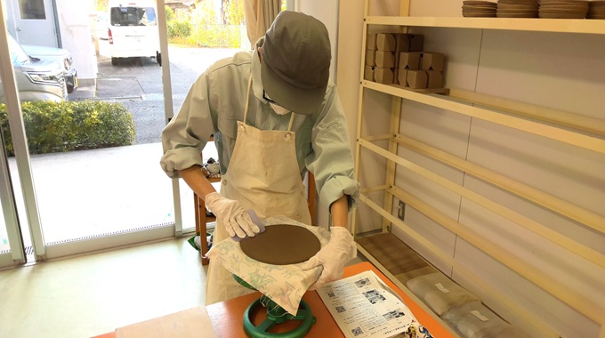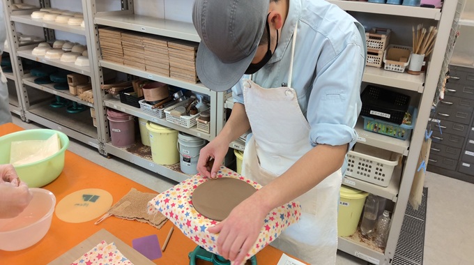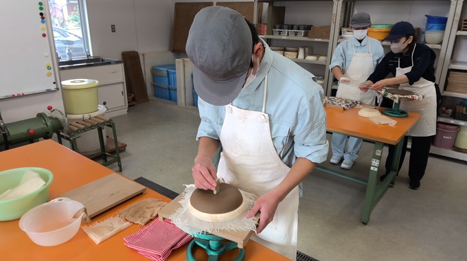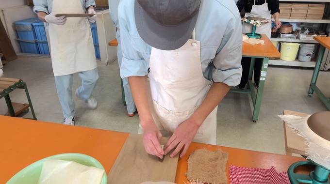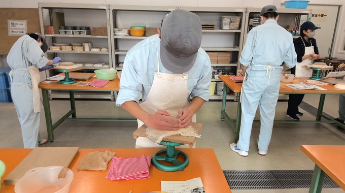 1年生の窯業では、丸皿と湯のみ作りに取り組んでいます。粘土は、気温、湿度によって硬さや柔らかさが違うので、そのときの状況に応じて力加減を変えながら作業する必要があります。